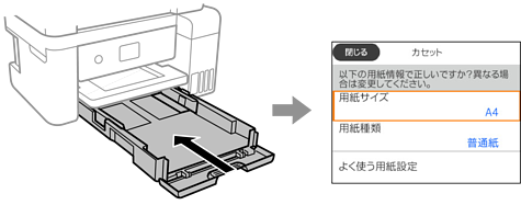 表示された用紙サイズや種類がセットした用紙と異なる場合は、項目を選択して変更してください。このままでいい場合は画面を閉じてください。