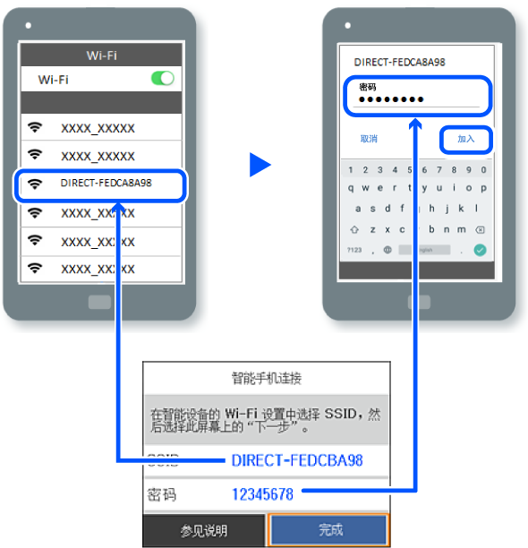 在设备的 Wi-Fi 屏幕上,选择本产品操作面板上显示的 SSID,然后输入密码。