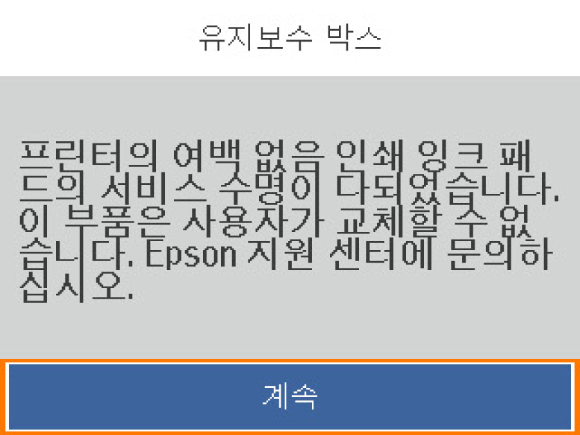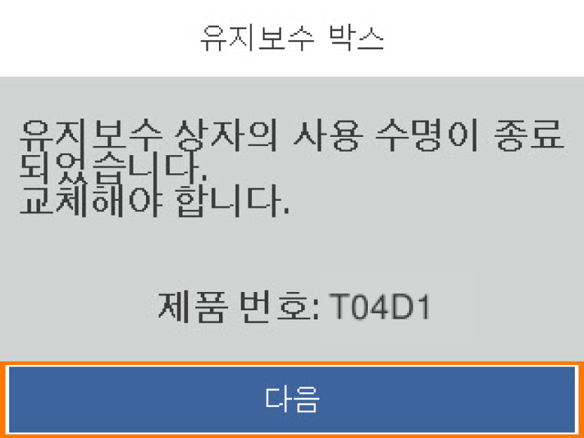 유지보수 상자 교체를 알리는 메시지가 표시되면 제어판에 표시되는 애니메이션을 참조하십시오. 유지보수 상자를 교체해야 한다고 해서 프린터가 제품 사양에 따라 작동이 중단된 것은 아닙니다. 교체 비용은 Epson의 무상 보증 서비스가 적용되지 않습니다. 사용자가 직접 교체할 수 있습니다.