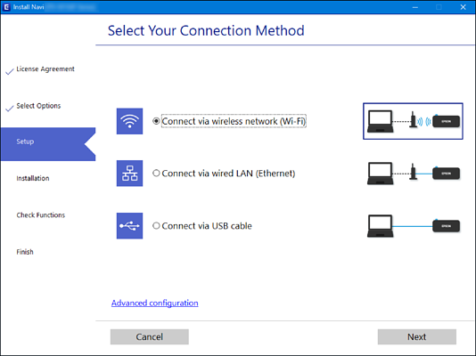 Изберете ја мрежната врска што сакате да ја користите, Поврзете се преку безжична мрежа (Wi-Fi) или Поврзи се преку жичан LAN (Ethernet), а потоа кликнете Следно.