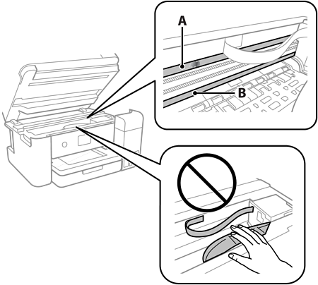 Yo‘naltiruvchi qurilmaga (B) tegib ketishdan ehtiyot bo‘ling. Aks holda, siz chop qila olmasligingiz mumkin. Yo‘naltiruvchi qurilma ustidagi yog‘ni artmang, chunki u printerning soz ishlashi uchun zarur.