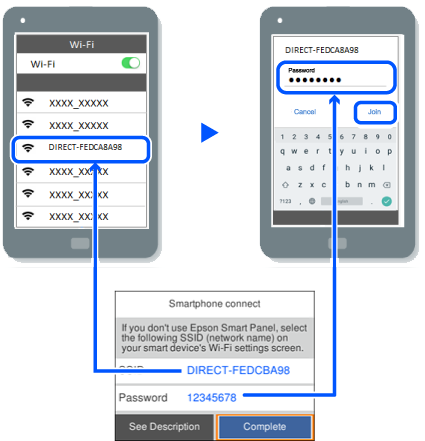 Qurilmaning Wi-Fi ekranida printerning boshqaruv panelida aks ettirilgan SSID ni tanlang va keyin parolni kiriting.