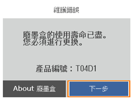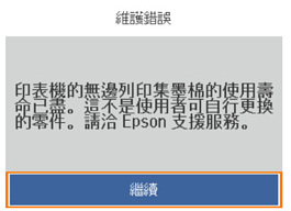 顯示下列畫面時,使用者不可更換該部分。請洽詢 Epson 支援服務。