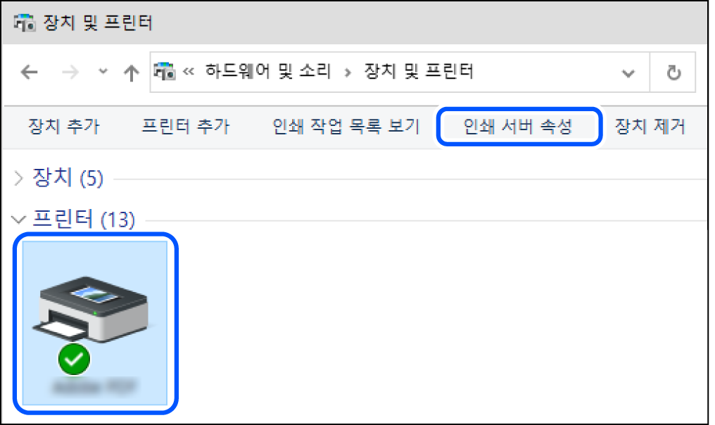 제어판 > 하드웨어 및 소리에서 장치 및 프린터 보기(프린터, 프린터 및 팩스)를 선택하고 프린터 아이콘을 클릭한 후 창 상단에 있는 인쇄 서버 속성을 클릭합니다.