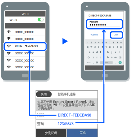 6 在移动设备的 Wi-Fi 屏幕中,选择打印机控制面板上展示的 SSID,然后输入密码。
