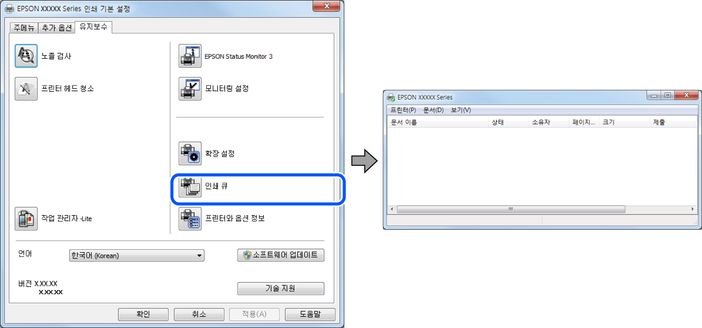 프린터 드라이버의 유지보수 탭에서 인쇄 큐를 클릭합니다.