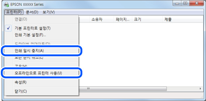 프린터가 오프라인 또는 보류 상태인 경우, 프린터 메뉴에서 오프라인 또는 보류 설정을 해제하십시오.