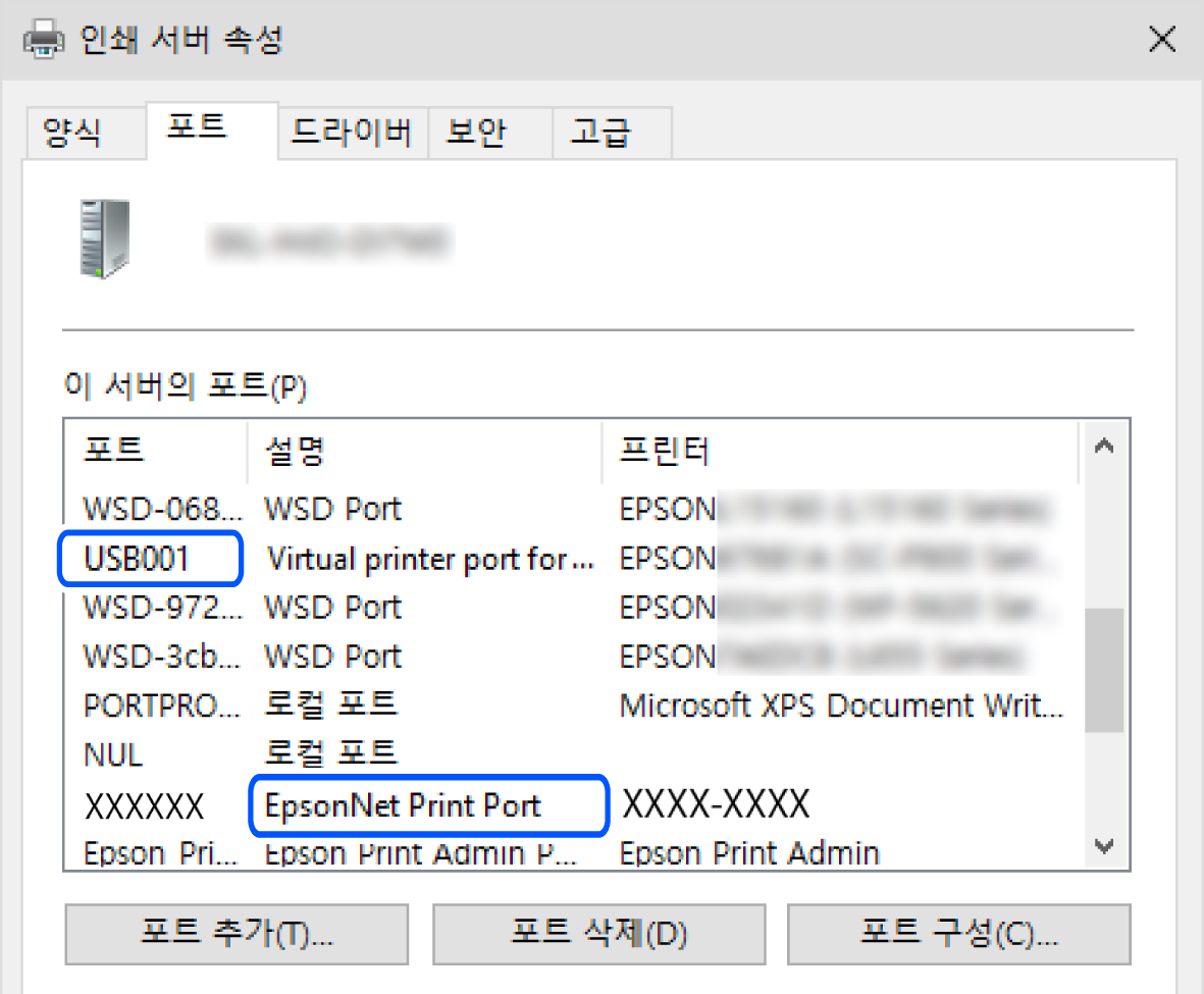 Epson 정품 프린터 드라이버(EPSON XXXXX)가 설치되어 있는지 확인하십시오. Epson 정품 프린터 드라이버가 설치되지 않은 경우 사용 가능한 기능이 제한됩니다. Epson 정품 프린터 드라이버 사용을 권장합니다.