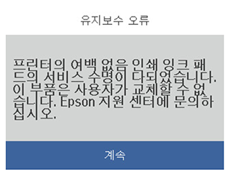 다음 화면이 표시되면 부품을 사용자가 교체할 수 없습니다. Epson 고객 지원 센터에 문의하십시오.