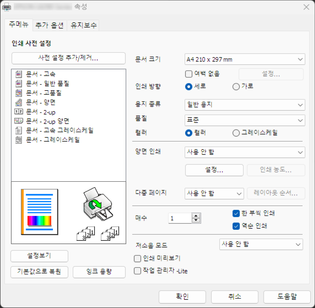 프린터 드라이버 창을 열려면 기본 설정 또는 속성을 선택합니다.