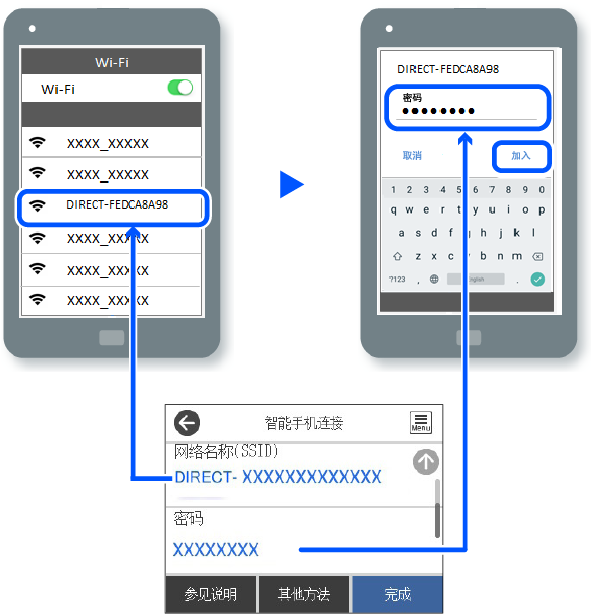 对于此前已连接到本产品的设备,在这些设备的 Wi-Fi 屏幕上选择网络名称 (SSID) 可重新连接。