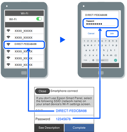 Στην οθόνη Wi-Fi της συσκευής επιλέξτε το SSID που εμφανίζεται στον πίνακα ελέγχου του εκτυπωτή και έπειτα πληκτρολογήστε τον κωδικό πρόσβασης.