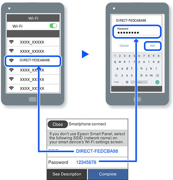 デバイスのWi-Fi接続画面を表示し、プリンターの操作パネルに表示されたSSIDを選択して、パスワードを入力します。
