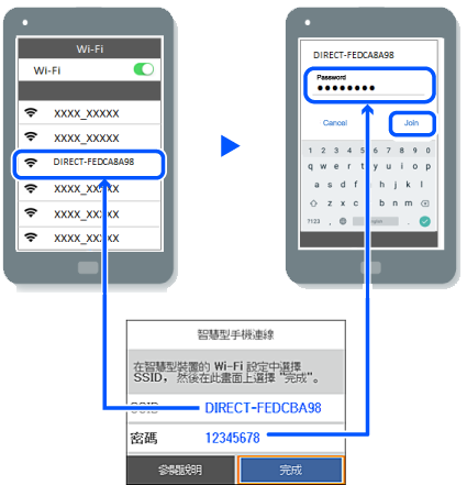 6 Aqlli qurilmaning Wi-Fi sozlamalari ekranida printer boshqaruv panelida keltirilgan SSID nomini tanlab, parolni kiriting.