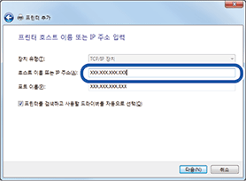 호스트 이름 또는 IP 주소 또는 프린터 이름 또는 IP 주소에 프린터의 IP 주소 또는 프린터 이름을 입력한 후 다음을 클릭합니다.