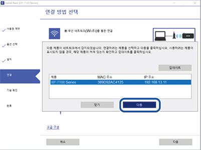 다음 화면이 표시될 때까지 화면의 지시에 따라 연결한 프린터 이름을 선택한 후 다음을 클릭합니다.
