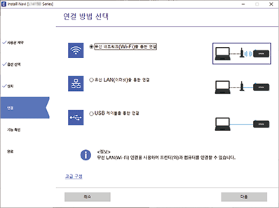 사용하려는 네트워크 연결, 무선 네트워크(Wi-Fi)를 통한 연결 또는 유선 LAN(이더넷)을 통한 연결을 선택한 후 다음을 클릭합니다.