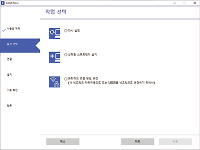작업 선택 화면에서 프린터의 연결 방법 변경(새 네트워크 라우터용으로 또는 USB를 네트워크로 변경하기 위해서)를 선택한 후 다음을 클릭합니다.