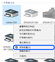 斷開 USB 線與電腦的連接。右鍵按一下電腦上顯示的印表機圖示,選取[刪除裝置]。接下來,連接 USB 線纜至電腦。