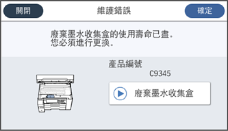 當顯示提示您更換廢棄墨水收集盒的訊息時,請參閱控制面板上顯示的動畫。根據印表機的規格,需要更換廢棄墨水收集盒不代表印表機停止運作。Epson 保固未涵蓋此項更換的成本。此為使用者可自行維修的零件。