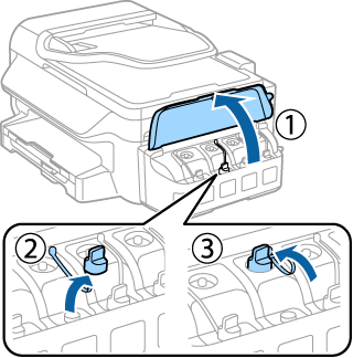 1 Otevřete kryt jednotky s nádržkami na inkoust a sejměte víčko nádržky na inkoust.