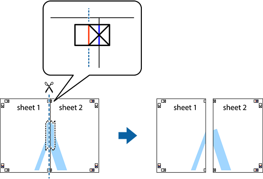 Nukirpkite Sheet 1 ir Sheet 2 paraštes pagal horizontalią mėlyną liniją, einančia per kairiojo ir dešiniojo kryžiukų vidurį.