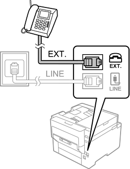 Če si napravi delita eno telefonsko linijo, morate telefonsko napravo priključiti v vrata EXT. na tiskalniku. Če linijo razdelite in ločeno priključite telefonsko napravo in tiskalnik, telefon in tiskalnik ne delujeta pravilno.