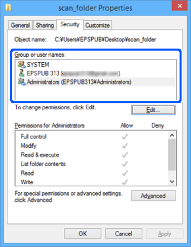 Dovoljenje za dostop v datotečnem sistemu (Varnost): ne dodajajte imen, ali pa dodajte imena uporabnikov/skupine, ki jim dovolite dostop