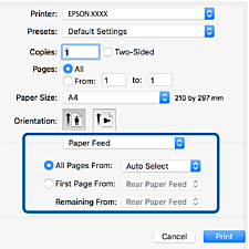 ポップアップメニューで[給紙]を選択して、給紙方法を設定します。