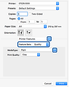 ポップアップメニューで[プリンタの機能]を選択し、[機能セット]で[印刷品質]を選択して、[用紙種類]でセットした印刷用紙の種類を選択します。