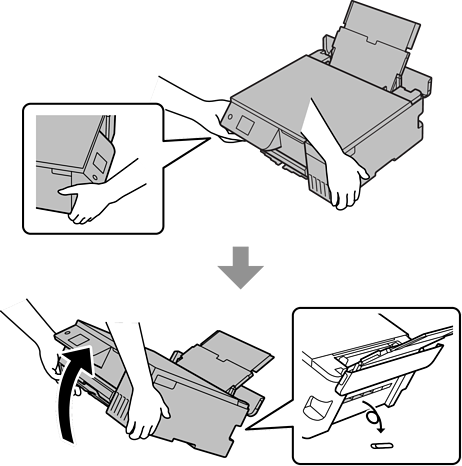 Με την πίσω τροφοδοσία χαρτιού τραβηγμένη προς τα έξω, κρατήστε και τις δύο πλευρές του μπροστινού μέρους του εκτυπωτή και γείρετε τον εκτυπωτή περίπου 45 μοίρες προς τα πίσω.
