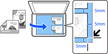 Tempatkan foto berjarak 5 mm dari tanda sudut pada kaca pemindai. Anda bisa menempatkan beberapa foto dan foto berukuran berbeda-beda.