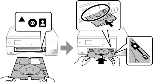 Sett inn disk-/ID-kortskuffen med PVC-ID-kortsiden av skuffen vendt mot skriveren. Sett inn til merkene på disk-/ID-kortskuffen er på linje med forsiden av skriveren.