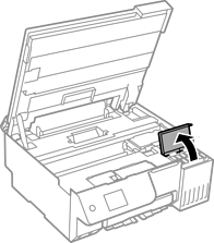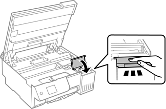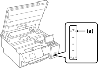 Se a tinta não começa a correr para o tanque, retire o frasco de tinta e voltar a inserir. No entanto, não remova e insira novamente o frasco de tinta quando a tinta chegar à linha superior. Se o fizer, a tinta poderá verter ou a impressora poderá sofrer danos se a tinta exceder a linha superior.