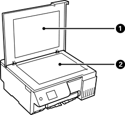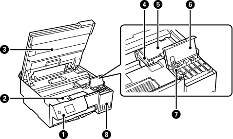 Digitaliza os originais colocados. Abra para encher o depósito de tinta ou para retirar papel encravado. Normalmente, esta unidade deve manter-se fechada. |