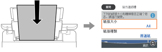 務必在放入紙張後顯示的畫面上登錄紙張大小和種類。當登錄的資訊與列印設定不同時,印表機會通知您。這可確保您不會由於使用不符合紙張類型的設定列印於錯誤紙張大小上或列印錯誤色彩,從而防止紙張和墨水浪費。