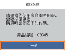 當廢棄墨水收集盒已滿時,您直到將其更換才能進行列印和清潔印字頭,以避免墨水滲漏。不過,您可執行不用使用墨水的操作,例如掃描。