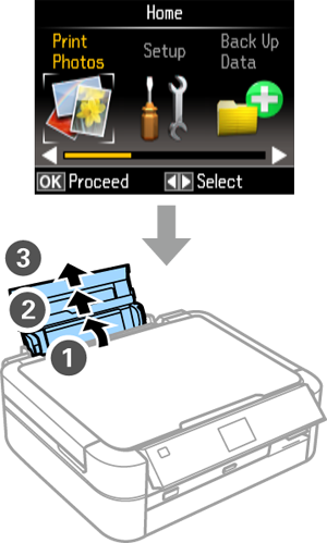 Vérifiez que l’écran d’accueil s’affiche sur l’imprimante. Ouvrez le couvercle d’alimentation papier arrière et dépliez le