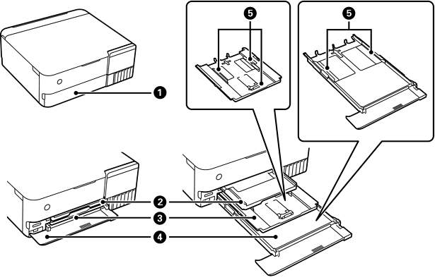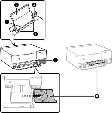 Holds the ejected paper. When you start printing, this tray is ejected automatically and the light turns on. If you tap Yes on the screen displayed when the printer is turned off, it is stored automatically. To store the tray manually,tap |