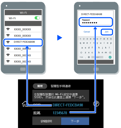 在裝置的 Wi-Fi 畫面上,選取印表機控制面板上顯示的 SSID,然後輸入密碼。