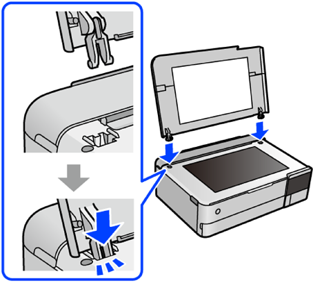 Otevřete krytku podavače a vložte kryt dokumentu svisle s úchytkami v rovné poloze.