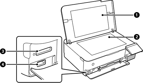 놓여있는 원본을 스캔합니다. 잉크 탱크 충전 또는 걸린 용지 제거 시 엽니다. 이 장치는 항상 닫아두십시오. |