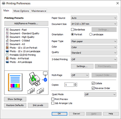 Chọn Tùy chọn hoặc Thuộc tính để truy cập cửa sổ trình điều khiển máy in.