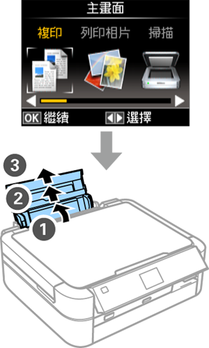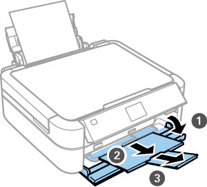 Make sure the home screen is displayed on the printer's screen. Open the rear paper feed cover and extend the paper support.
