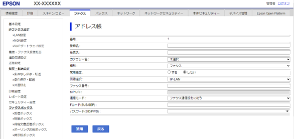 アドレス帳に宛先を登録するときに、回線の設定でIPファクス([IP-LAN]または[IP-NGN])を選択できます。