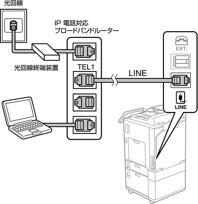 IP電話対応のブロードバンドルーターとプリンター背面部のLINEポートをモジュラーケーブルで接続します。詳しくはご契約の回線事業者に問い合わせてください 。