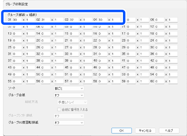 部数が同じクラスが複数ある場合は、組数(セット数)を変更することでグループをまとめることができます。上の画面の例の場合、グループ01と04が同じ部数のため、グループ01の組数を2にすることでグループ04の設定が不要になります。