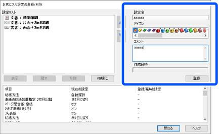 [設定名]と必要に応じて[コメント]を入力し、[登録]をクリックします。入力した設定名が、[設定リスト]に追加されます。