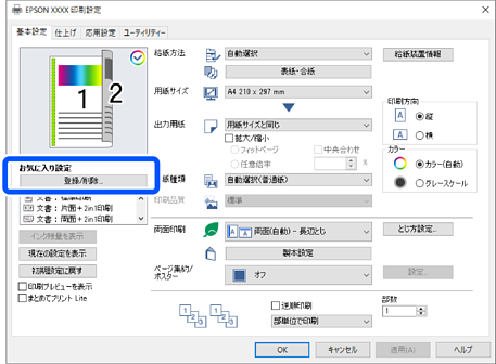 [基本設定]タブまたは、[応用設定]タブから[お気に入り設定]の[登録/削除]をクリックします。
