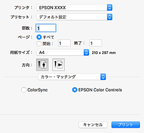 色補正の方法を選択します。プリンターで色の調整を行い、異なるデバイス間の色合いを近づけることができます。